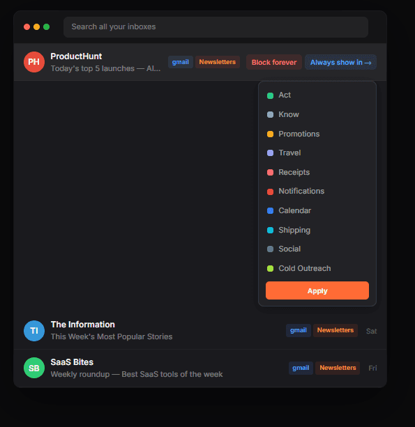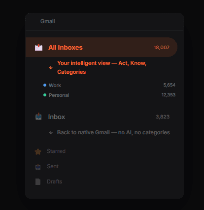 Every email is routed to Act, Know, or Browse. Instantly. No rules to set up.